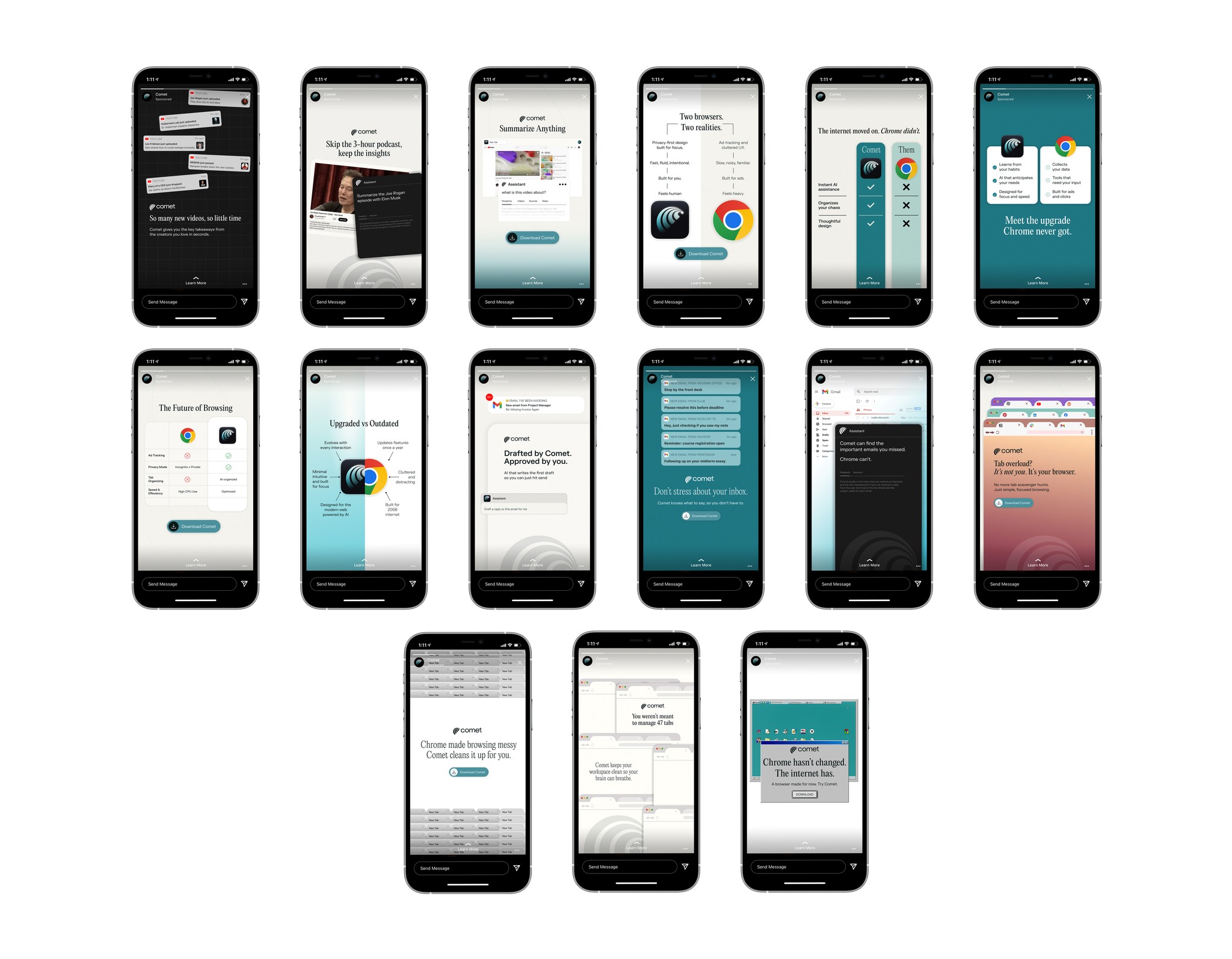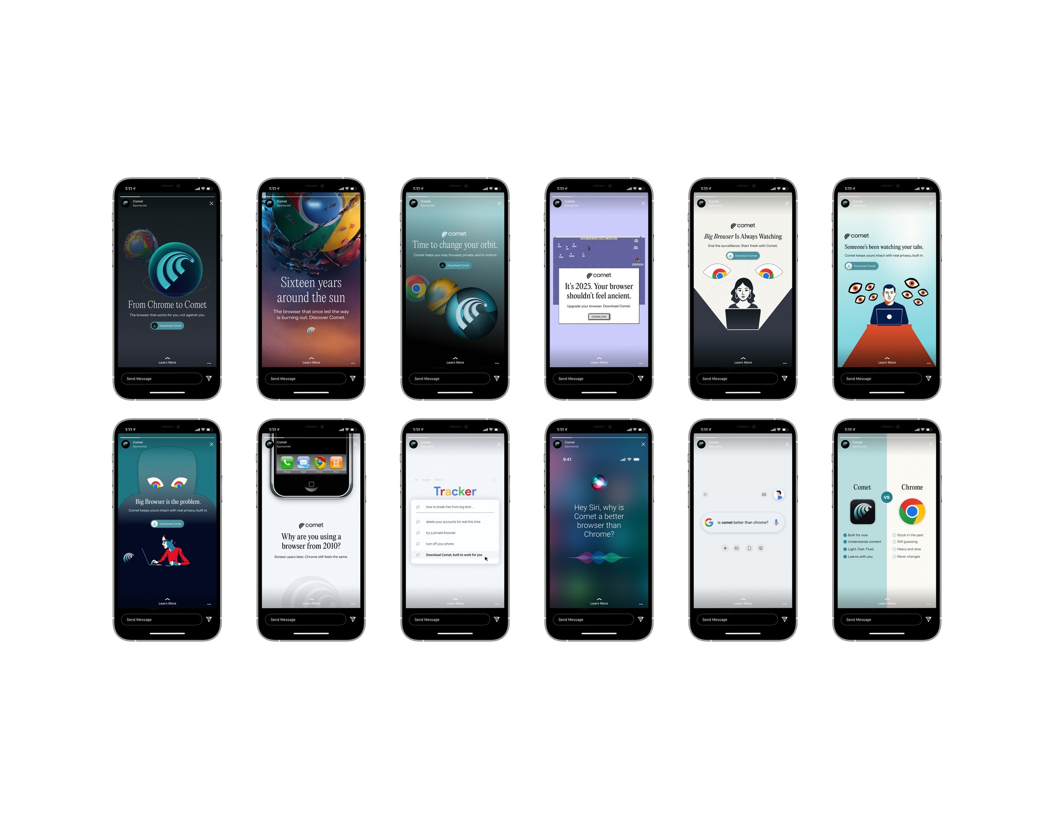 Delivered a cohesive set of 30+ ad creatives featuring bold typography, gradient backgrounds, illustrative elements (e.g., orbiting Chrome, watching eyes for tracking, clean Comet UI mocks), comparison charts, and punchy copy like "The internet moved on. Chrome didn't." and "Time to change your orbit." Emphasized themes of privacy control, focus over distraction, and AI that actually helps (summarizing, organizing, drafting) vs. passive browsing. The result: a campaign that felt premium yet approachable, built instant credibility in a skeptical space, and sparked conversations around modern browsing—aligning perfectly with Comet's mission to rethink the browser from the ground up.