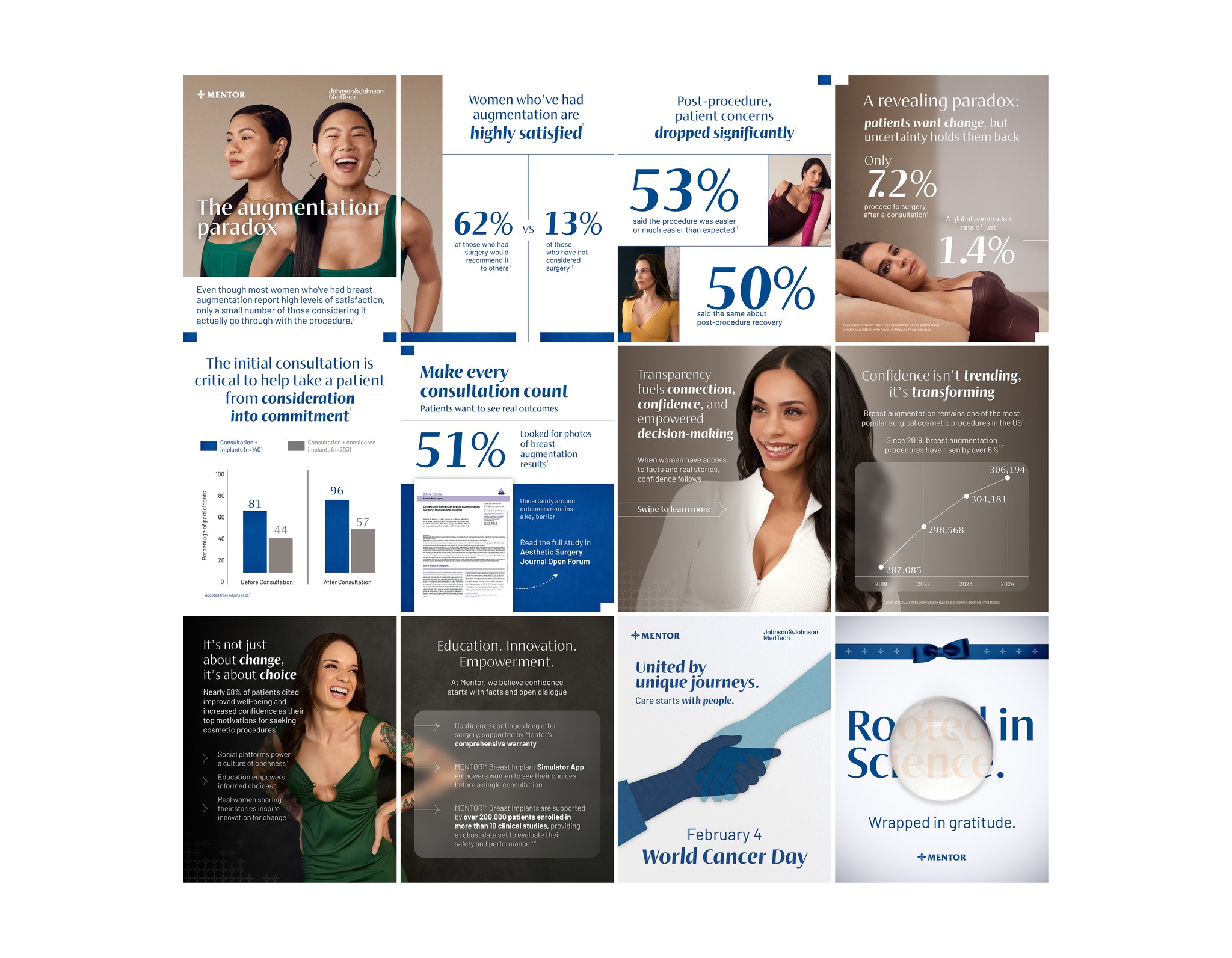 MENTOR™, part of Johnson & Johnson MedTech, leads in breast aesthetics with MemoryGel™ implants, backed by decades of research, lifetime rupture warranties, and high patient satisfaction (e.g., 97–99% in studies). The project focused on professional and patient-facing materials to reinforce trust in a category where education, transparency, and surgeon partnerships drive decisions—addressing concerns like safety, outcomes, and post-procedure confidence while positioning MENTOR as the premium, science-rooted choice. I handled print assets for providers (e.g., welcome books, program overviews) and LinkedIn creatives/ads speaking directly to doctors (education/partnership) and patients (empowerment, real stories, stats on satisfaction/confidence growth).