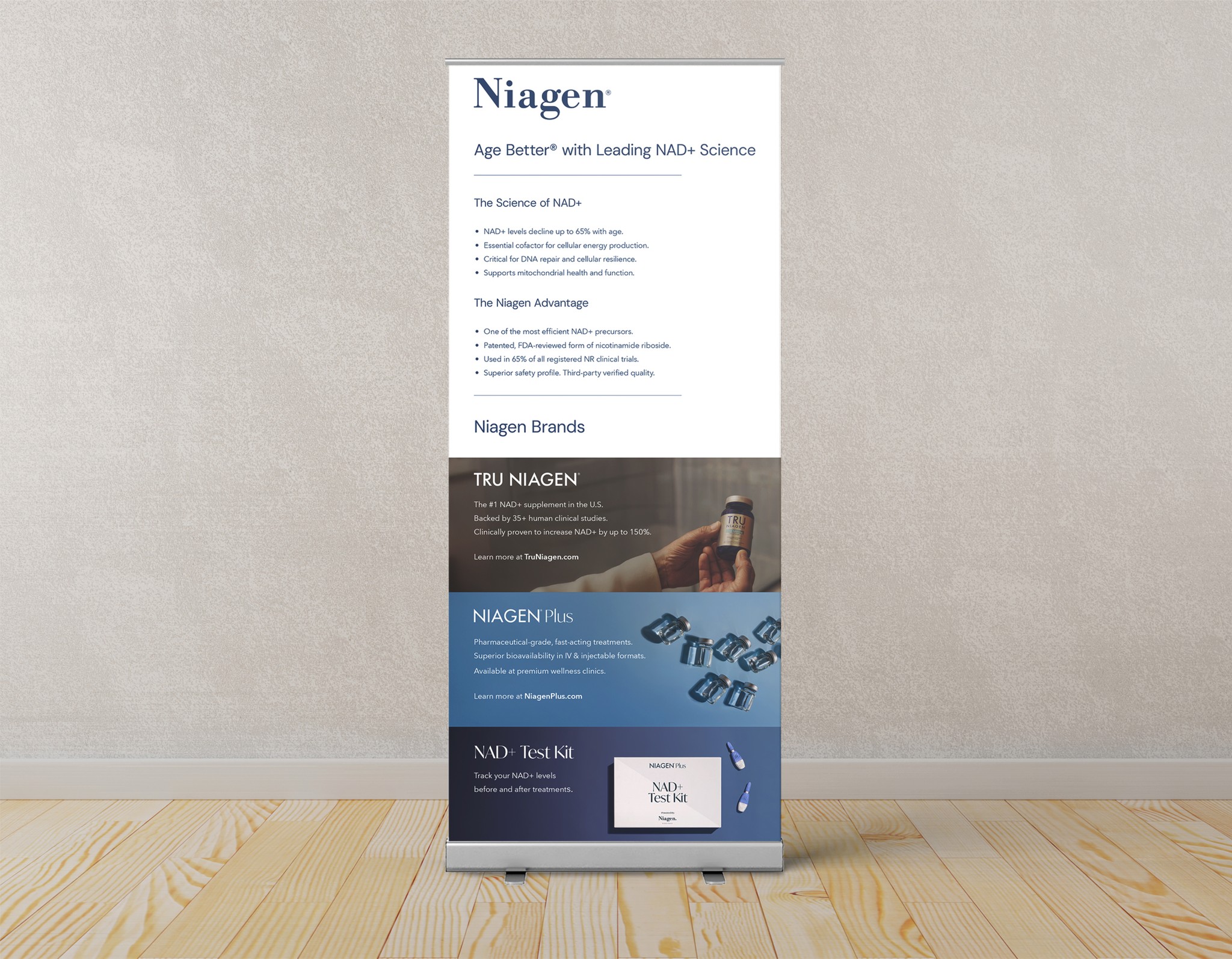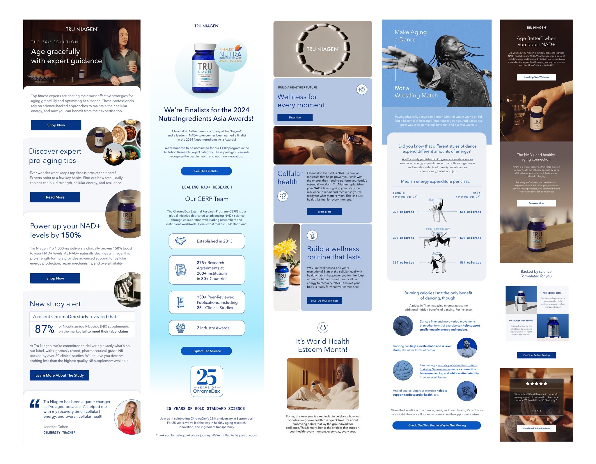 I guided the brand’s evolution in phases, from website and identity launches to smaller internal shifts. By gradually refining typography, layouts, packaging, photography, and campaign design, I kept updates cohesive and natural. This approach ensured Tru Niagen stayed modern, consistent, and trusted across every touchpoint.
