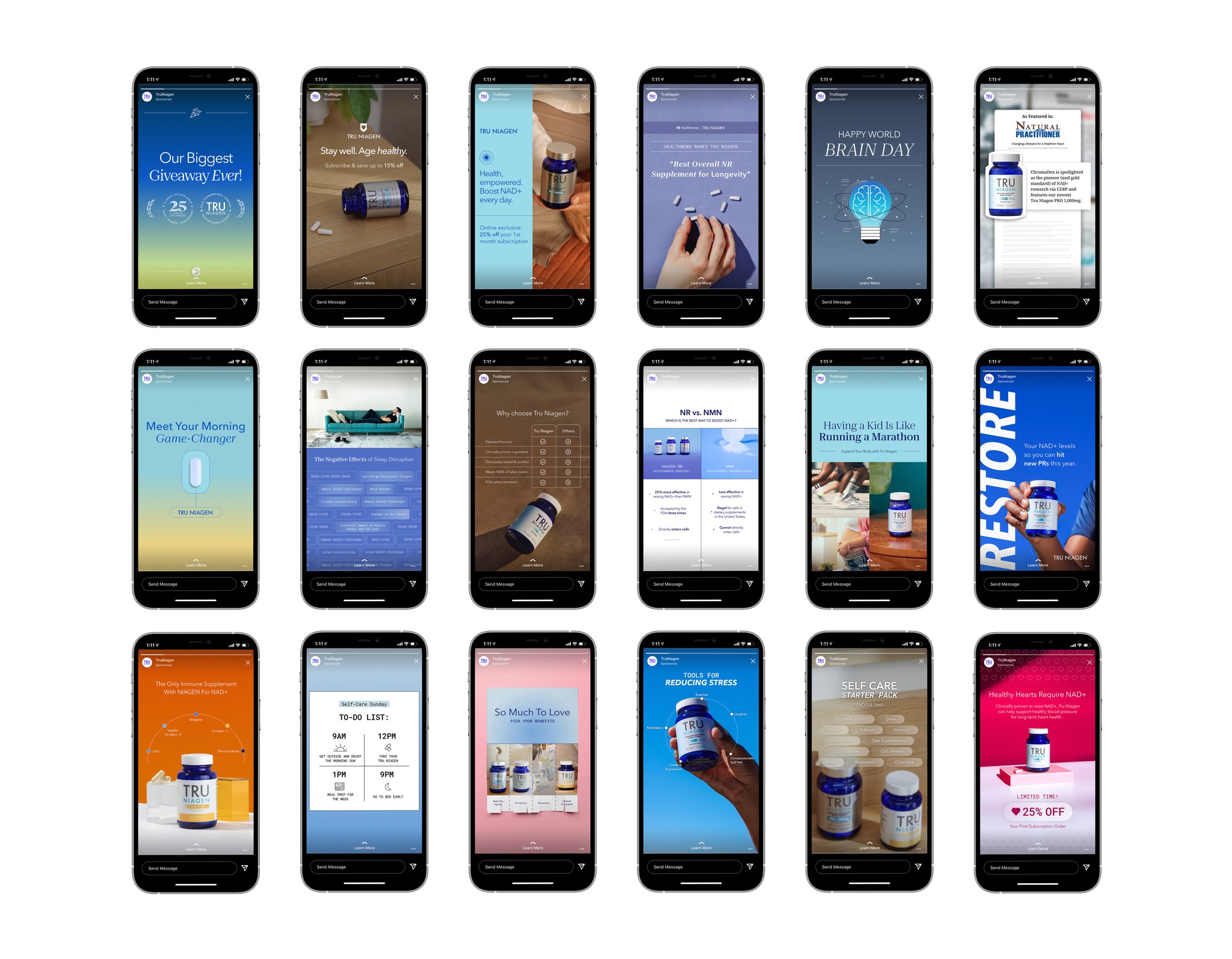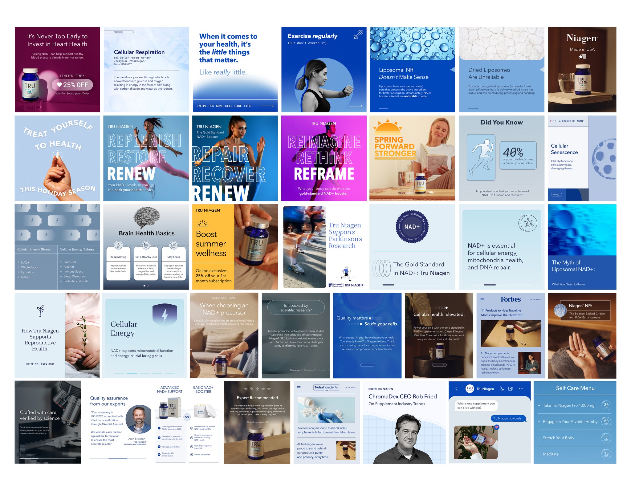 Tru Niagen is a leading NAD+ supplement brand that needed to adapt constantly as the category evolved. The challenge was to stay compliant and credible while appealing to both new and existing customers. My role spanned social, email, paid ads, packaging, and print, where design had to balance science with lifestyle and position Tru Niagen as the gold standard in the space.